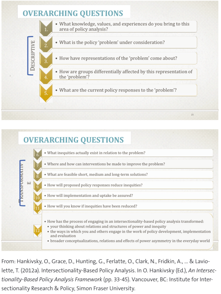 Read through the questions and consider how they apply an intersectional lens to policy. What do you note? What questions arise for you?